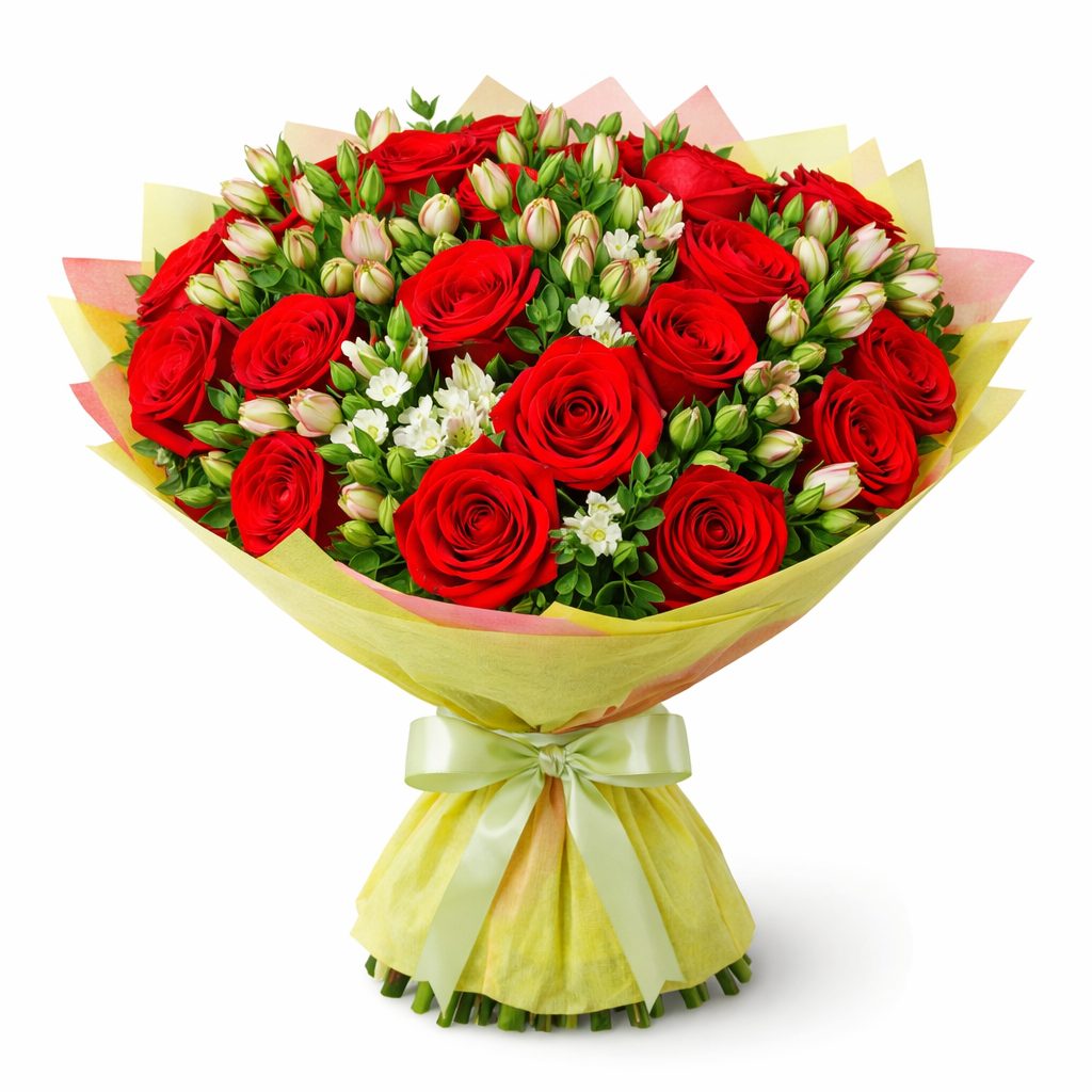 Роскошное сочетание красной кустовой розы, розовой альстромерии и мини белой гвоздики, дополненное свежей зеленью, создаёт неповторимую гармонию. Букет оформлен в яркую матовую плёнку с атласной лентой, придающей ему особую элегантность. Альтернативные варианты упаковки: крафт-бумага или декоративная сетка. Прекрасный выбор для любимой на день рождения или годовщину.
