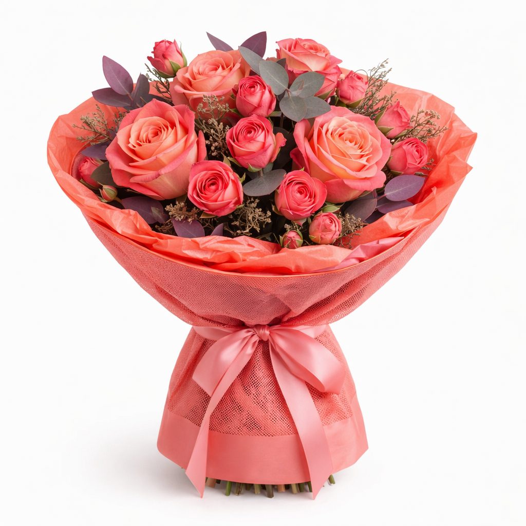Розовые одноголовые и кустовые розы в сочетании с эвкалиптом создают нежную и романтичную композицию. Букет оформлен в матовую плёнку и перевязан атласной лентой, что придаёт ему изысканность. Альтернативно можно использовать крафт-бумагу или декоративную сетку. Прекрасный выбор для подарка на день рождения для любимой.