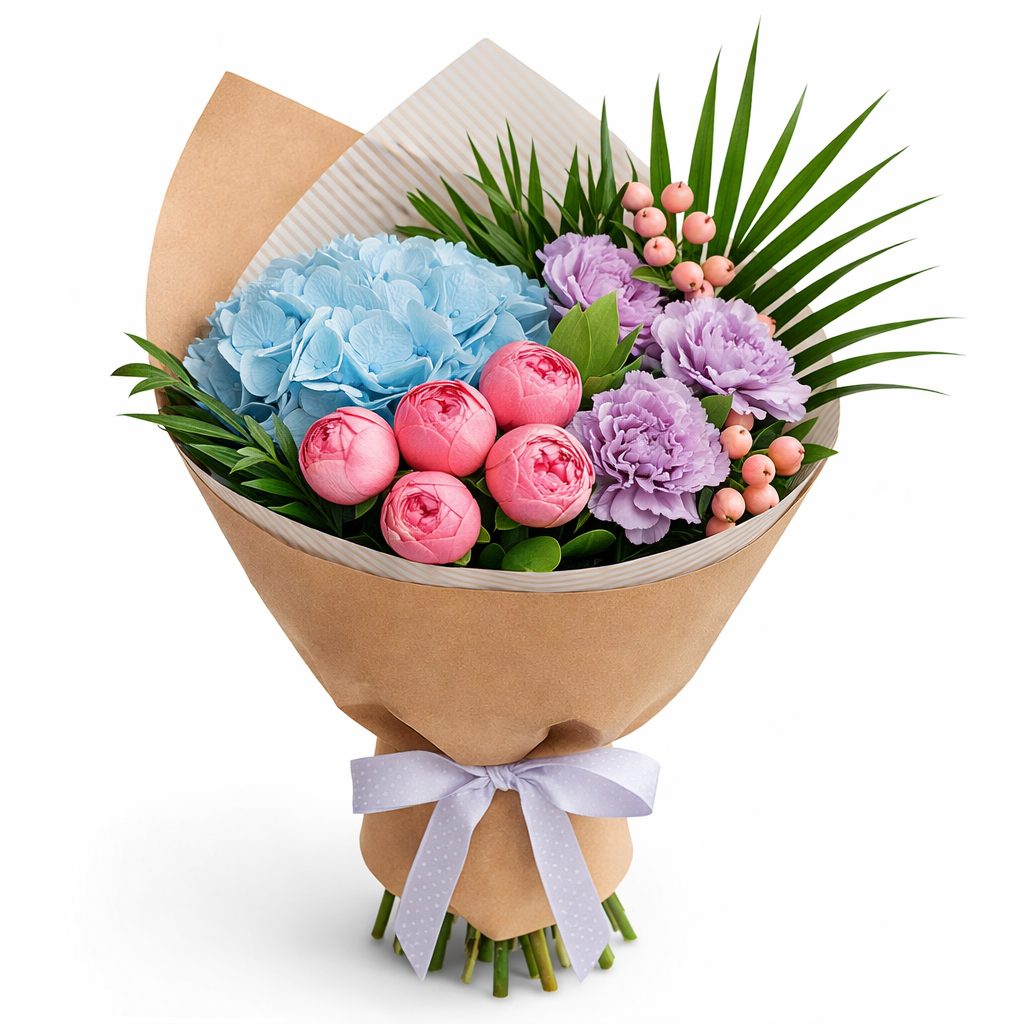Голубая гортензия, розовые пионовидные розы и сиреневые гвоздики создают гармоничную композицию, дополненную гиперикумом и зеленью фисташки и папоротника. Букет оформлен в крафт-бумагу с матовой плёнкой и перевязан белой лентой в горошек. Возможны альтернативы упаковки: атласная лента или декоративная сетка. Прекрасный подарок для любимой на день рождения.