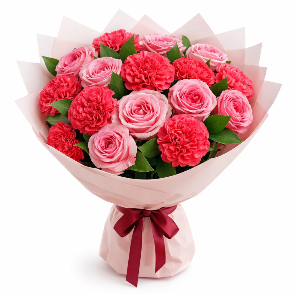 Розовые одноголовые розы и бордовые диантусы создают яркий и насыщенный букет, который впечатляет своей красотой. Упакован в матовую плёнку нежно-розового цвета и перевязан атласной лентой. Альтернативные варианты оформления: крафт-бумага или декоративная сетка. Подойдёт для подарка на день рождения для любимой.