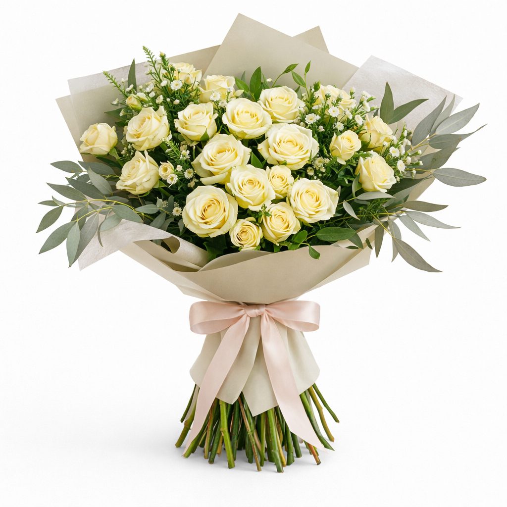 Кремовые кустовые розы в сочетании с изящной вероникой и нежным ваксфлауэром создают утончённую композицию. Эвкалипт добавляет свежести и объёма. Букет перевязан атласной лентой и обёрнут в матовую плёнку, подчёркивая его элегантность. Возможны варианты упаковки с декоративной сеткой или крафт-бумагой. Прекрасный подарок для любимой на годовщину или день рождения.