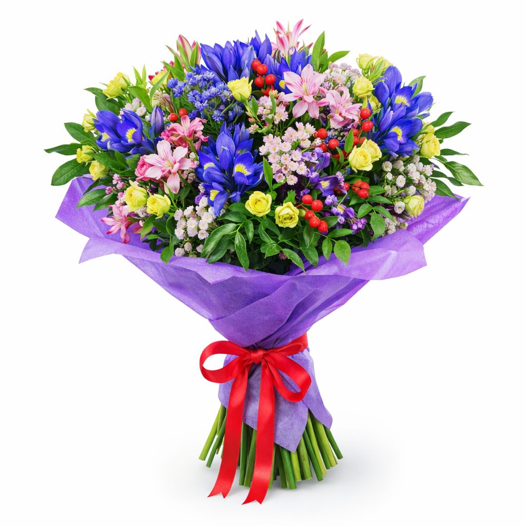 Яркие синие ирисы, нежные розовые альстромерии и амарины, жёлтые кустовые розы в сочетании с гиперикумом и гипсофилой создают гармоничную композицию. Букет оформлен в матовую плёнку и перевязан атласной лентой. Альтернативные варианты упаковки: крафт-бумага или декоративная сетка. Прекрасный выбор на день рождения для любимой.