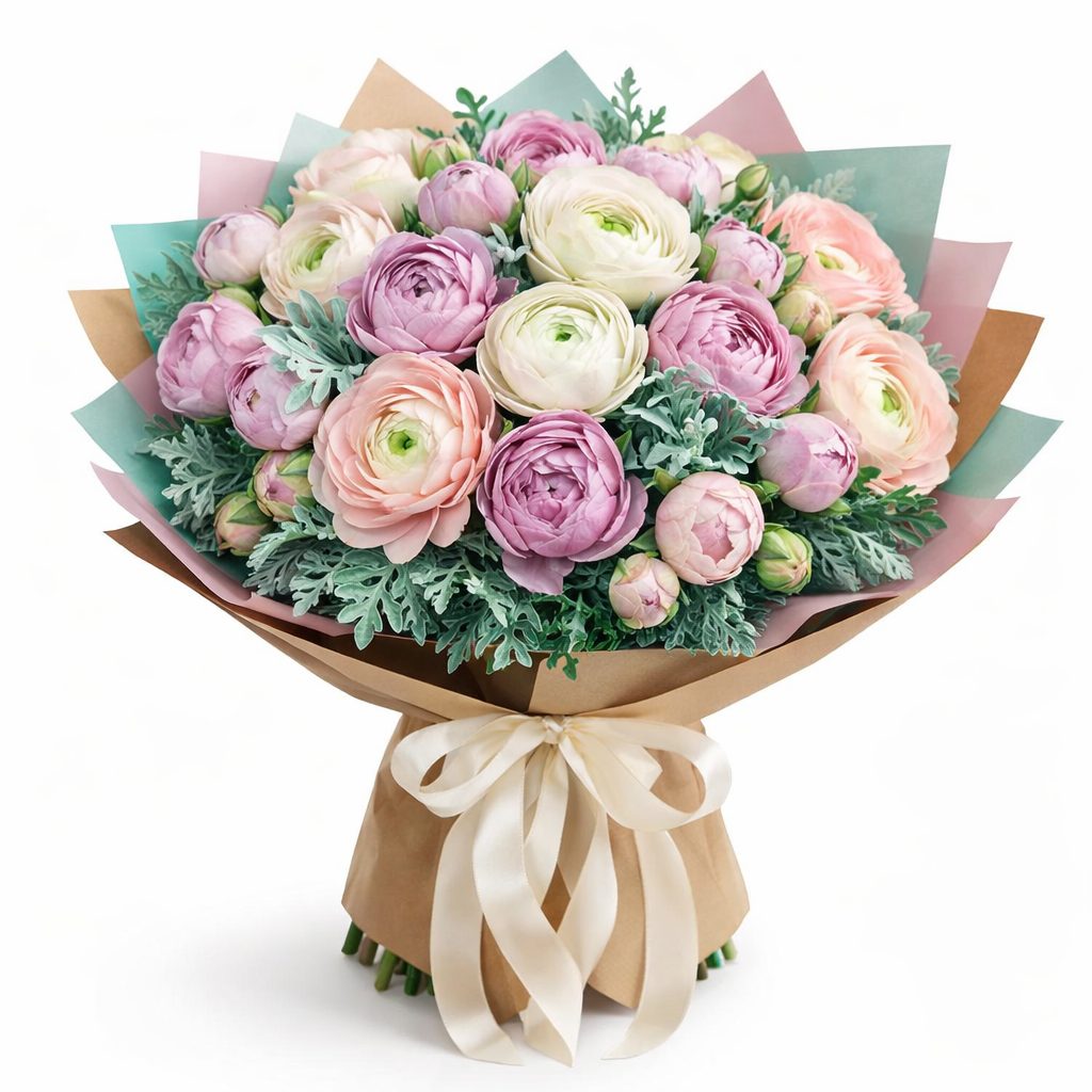 Сиреневые пионовидные кустовые розы и розовые ранункулюсы создают нежное сочетание, дополненное свежей зеленью. Букет оформлен в матовую пленку пастельных оттенков и перевязан атласной лентой. Возможны варианты упаковки с крафт-бумагой или декоративной сеткой. Прекрасный выбор для любимой на день рождения или годовщину.