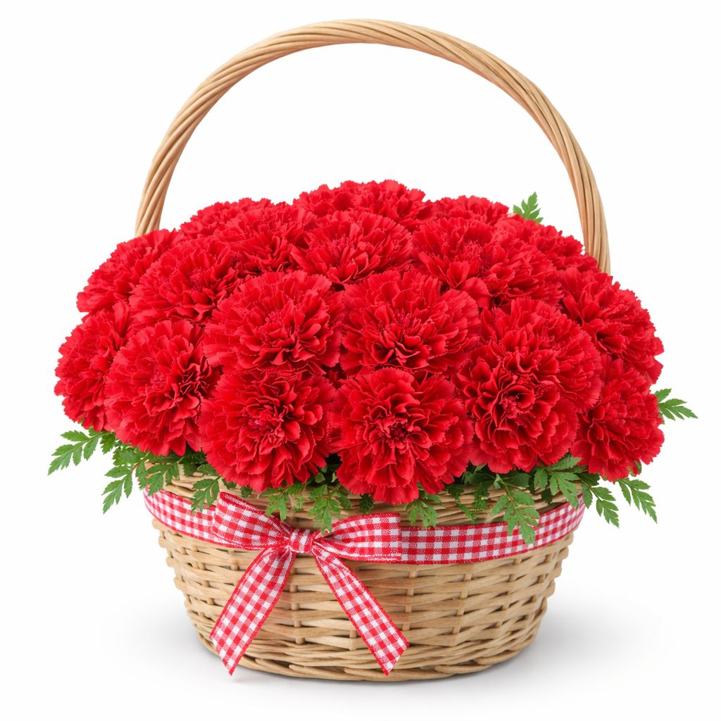 Яркие красные гвоздики создают впечатляющую композицию в плетёной корзине, придавая ей элегантность и выразительность. Корзина украшена клетчатой лентой, добавляющей шарм и завершённость. Альтернативное оформление возможно в корзине из лозы или с тканевой отделкой. Прекрасный подарок на юбилей для любимой.