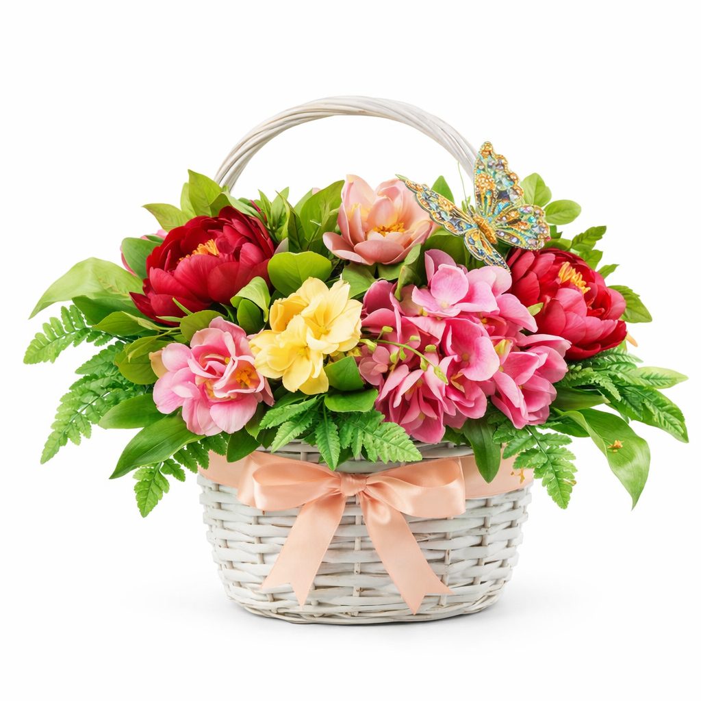 Эта изысканная композиция сочетает в себе розовую гортензию, красный пион, кремовую герберу и зелёную каллу, украшенные декоративной бабочкой. Белая плетёная корзина подчёркивает нежность и элегантность цветов. Возможны альтернативы оформления: корзина из лозы или корзина из ротанга. Прекрасный подарок для любимой на годовщину или для мамы на День матери.