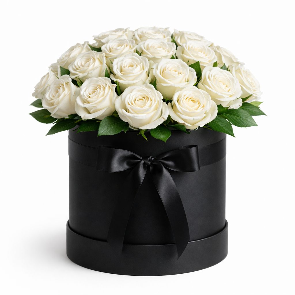 Элегантная композиция из белых роз и зелени в шляпной коробке создаёт атмосферу утончённой красоты. Чёрная шляпная коробка подчёркивает нежность белых бутонов. Возможны варианты оформления в бархатной или атласной коробке. Прекрасный подарок для любимой на годовщину или день рождения.