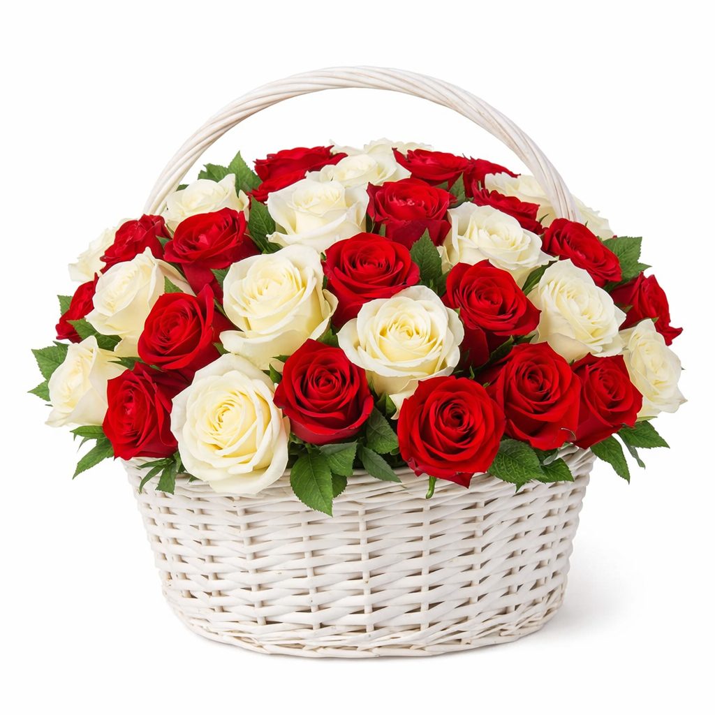 Эта изысканная композиция из красных и белых одноголовых роз создаёт атмосферу романтики и утончённости. Цветы аккуратно размещены в белой плетёной корзине, подчёркивая их естественную красоту. Альтернативой может стать корзина из лозы или ротанга. Подойдёт для подарка на годовщину или для любимой.