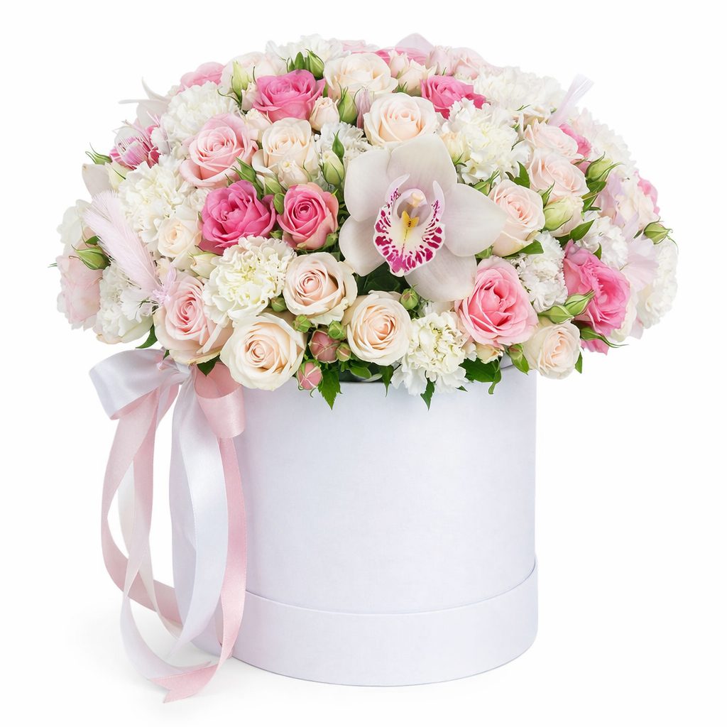 Эта изысканная цветочная композиция сочетает в себе белоснежные орхидеи, розовые и кремовые кустовые розы, белые гвоздики и статицу, дополненные декоративными перьями. Все цветы аккуратно расположены в элегантной шляпной коробке, перевязанной лентой. Для более оригинального оформления можно выбрать бархатную или атласную коробку. Прекрасный подарок для любимой на годовщину или для мамы на день рождения.