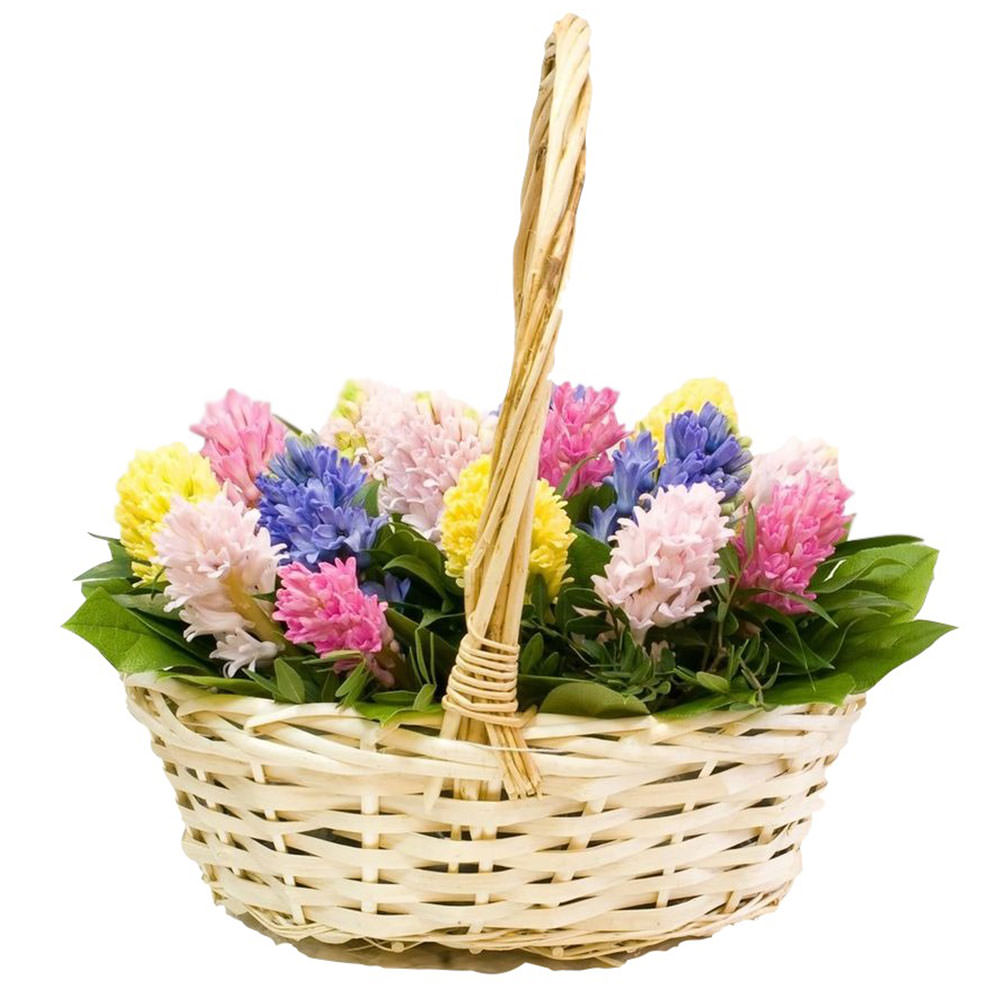 Яркие гиацинты в розовых, жёлтых, голубых и белых тонах, дополненные эвкалиптом, создают атмосферу весеннего праздника. Цветы аккуратно размещены в плетёной корзине с оазисом, что сохраняет их свежесть. Возможны варианты оформления в корзине из лозы или ротанга. Прекрасный подарок для любимой на 8 марта или день рождения.