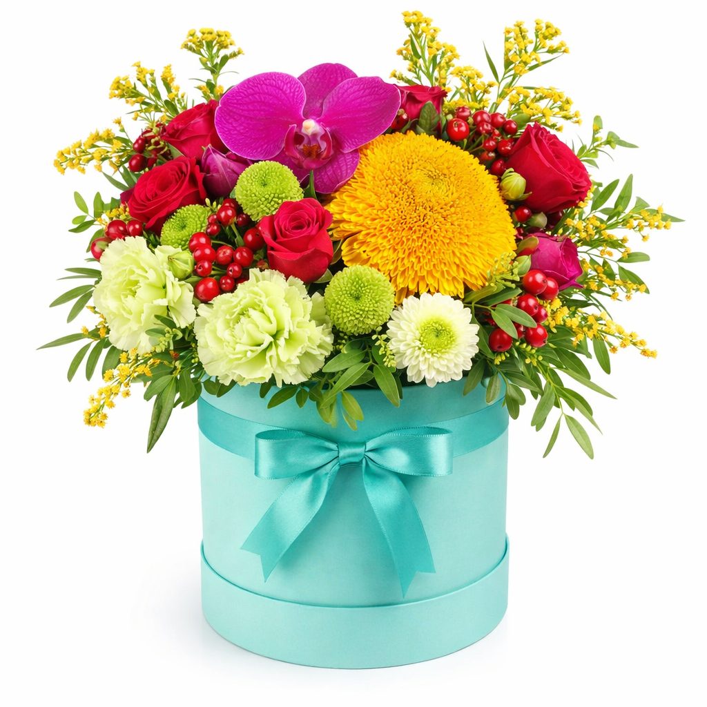 Яркая композиция из орхидеи Ванда, кремовой гвоздики, розовой кустовой розы и подсолнечника тедди беар создаёт атмосферу солнечного праздника. Зеленая и белая кустовая хризантема, гиперикум и солидаго добавляют свежести и легкости. Цветы оформлены в стильной бирюзовой шляпной коробке. Возможны альтернативы оформления: бархатная коробка или коробка с принтом. Прекрасный подарок для любимой на день рождения.