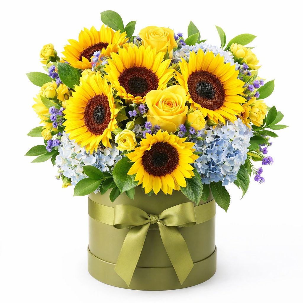 Яркие подсолнухи, голубая гортензия и желтые розы создают солнечное настроение в этой композиции. Шляпная коробка нежного оливкового цвета подчеркивает свежесть и яркость цветов. Возможны варианты оформления в бархатной или атласной коробке. Прекрасный подарок для любимой на день рождения или годовщину.